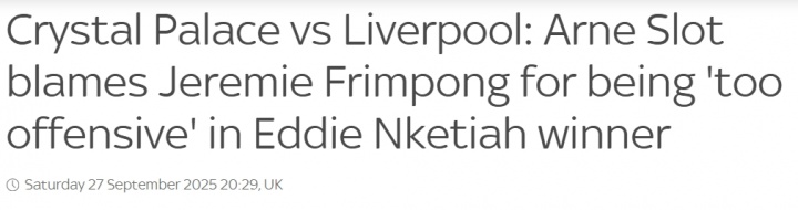 09月28日讯 本轮英超利物浦客场应战 1-2遭水晶宫读秒致胜球 ,赛后利物浦主帅斯洛特指责队内某名球员攻击 欲望太强导致球队失球,引发热议。