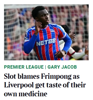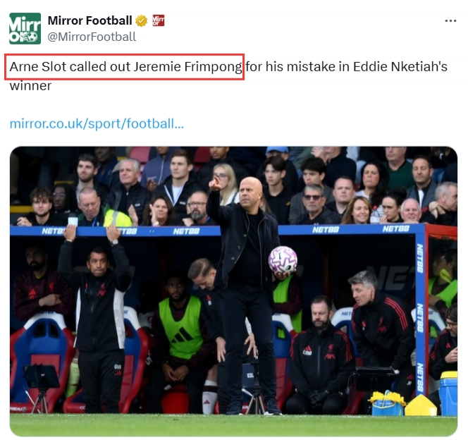 天空体育和《泰晤士报》均指出,斯洛特赛后指责的这名球员是弗林蓬,《利物浦回声报》也表示,斯洛特的这番言论暗示的是弗林蓬在最后时刻的防卫 错误 。《镜报》也以“斯洛特透明 指责弗林蓬”为题发布文章。