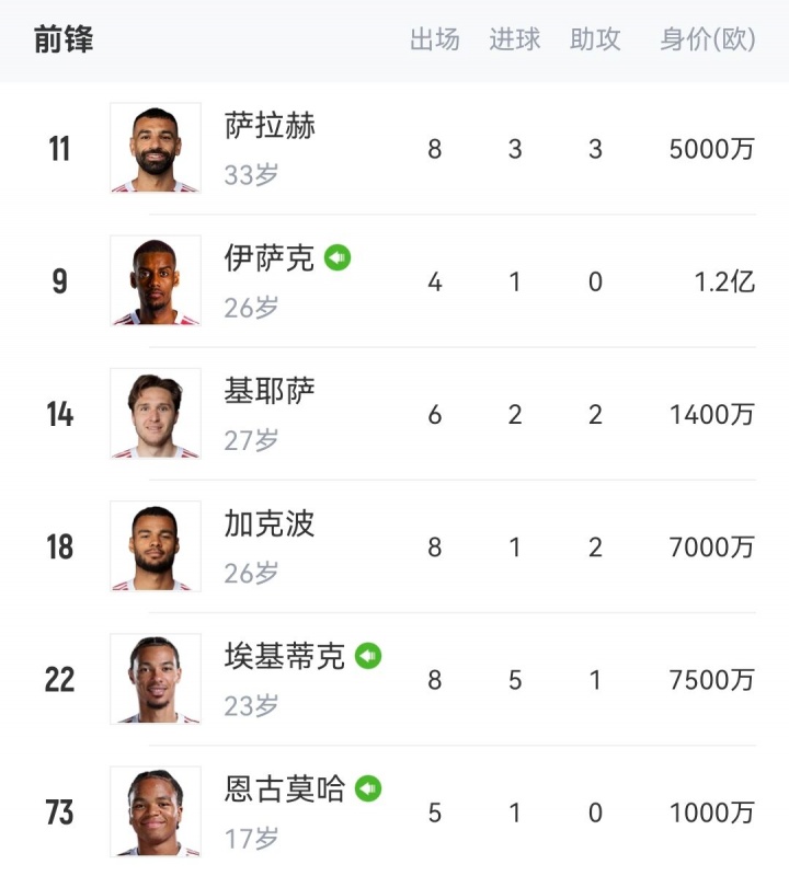 目前伊萨克和维尔茨两位“标王”的表现目前都还不能让人满意,萨拉赫随着年龄的增长在盘带冲破 时也显得力不从心,而加克波则因单一的攻击 手段遭到诟病。反倒是后备 出战的基耶萨和恩古莫哈时不时会给球迷带来惊喜。