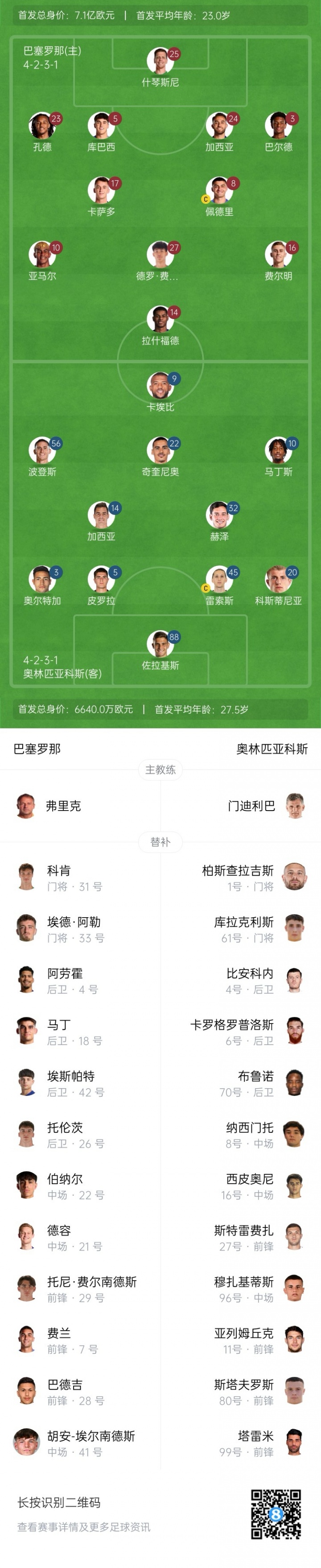 巴萨杆位:25-什琴斯尼、23-孔德、24-埃里克·加西亚、5-库巴西、3-巴尔德、17-卡萨多、27-德罗·费尔南德斯、8-佩德里、16-费尔明、10-亚马尔、14-拉什福德