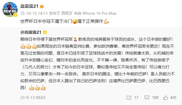 10月15日讯 昨日的麒麟杯,日本主场作战 让二追三反转 击败巴西。今日,前国脚高雷雷发文再次谈到日本古代足球 。