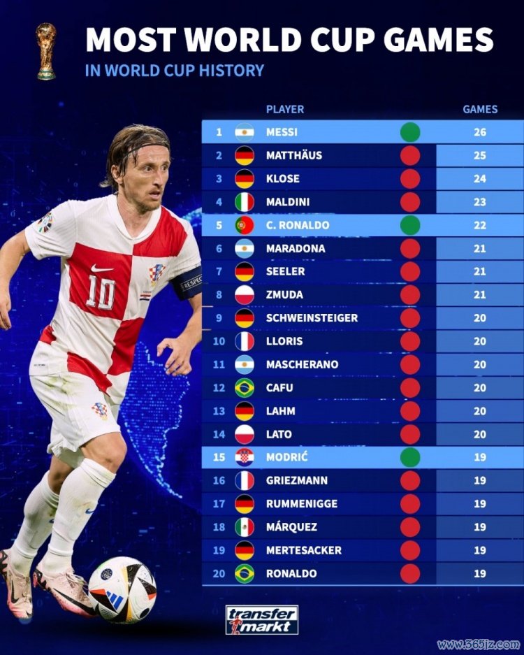 11月15日讯 克罗地亚获得世界杯赛 参赛资格,莫德里奇将迎来第5届世界杯赛 ,德国转会市场统计了球员在世界杯赛 的出场次数,足球直播无插件免费在线观看并列出榜单,梅西26场居首,C罗22场、莫德里奇19场。